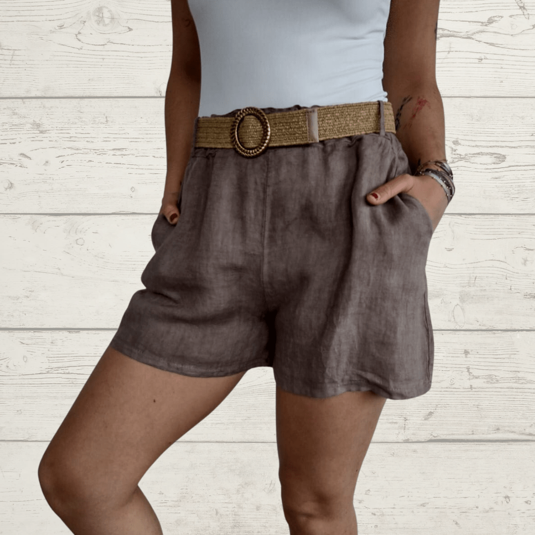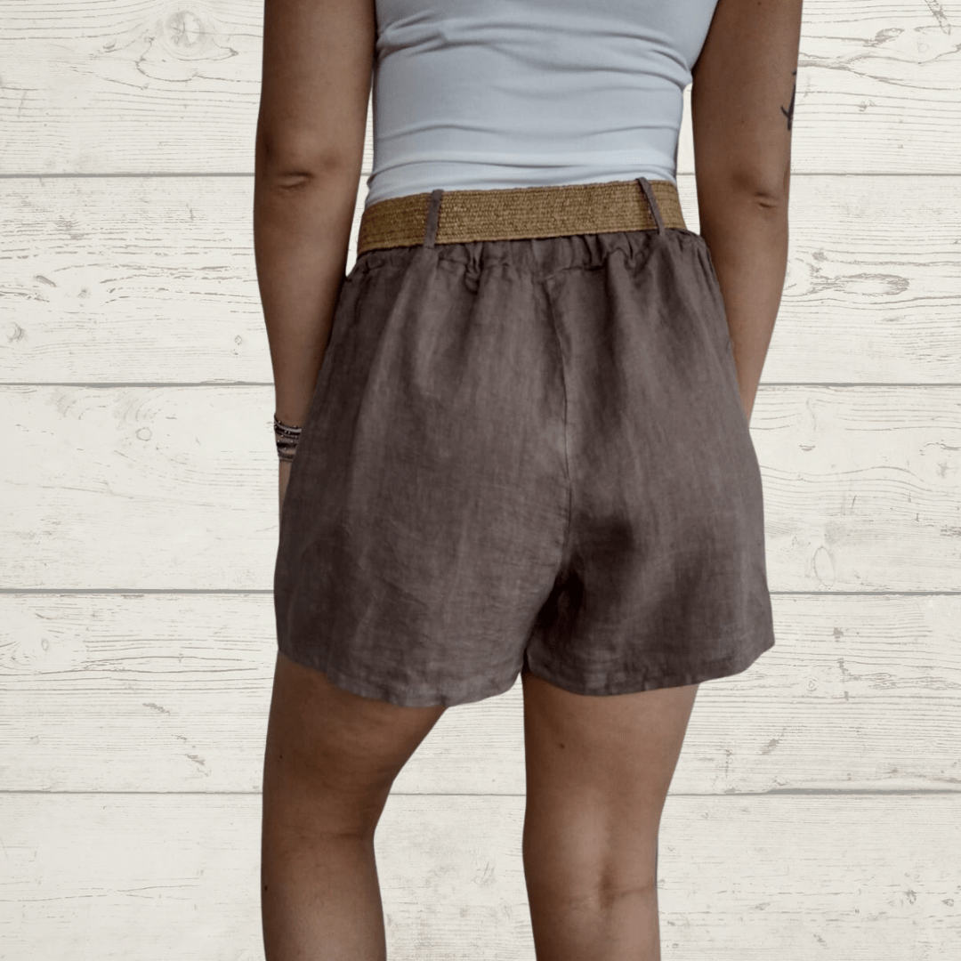 Short de Lino Italiano con bolsillos a los lados, pretina con elástico en la espalda, con cinturón, color chocolate