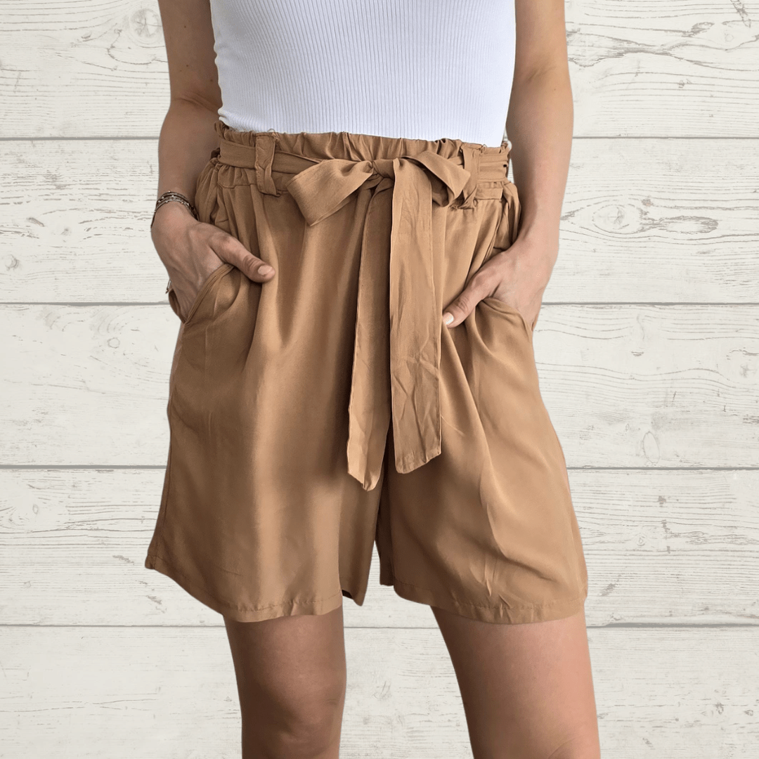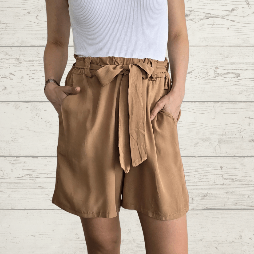 Short Italiano de viscosa con lazo en la cintura, pretina elasticada, bolsillos a los lados, color camel