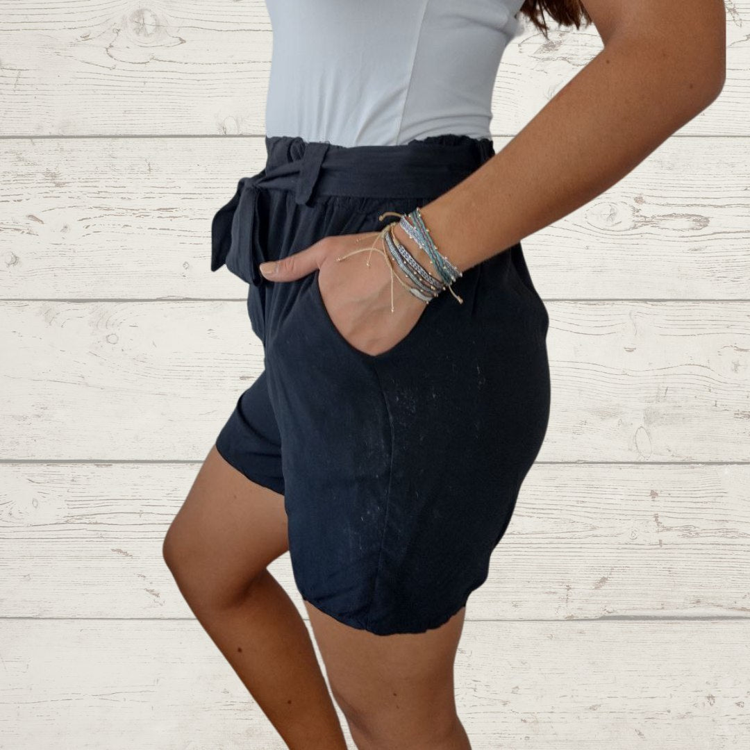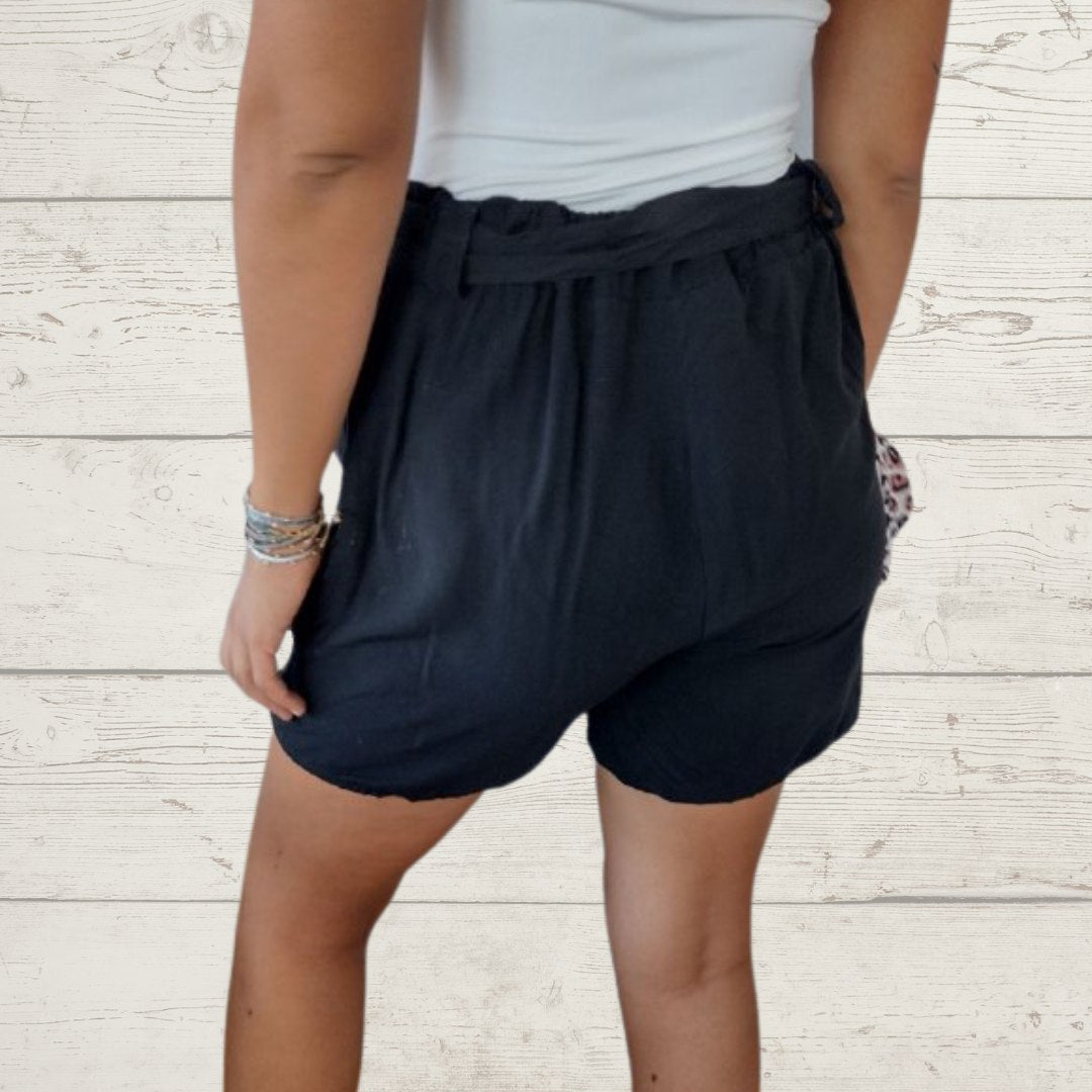 Short Italiano de viscosa con lazo en la cintura, pretina elasticada, bolsillos a los lados, color negro