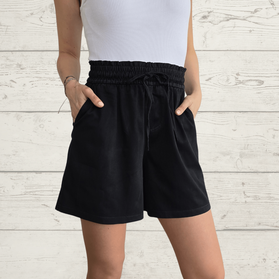 Short jeans , de algodón con spandex,, con 4 bolsillos y lazo en la cintura, color negro jeans