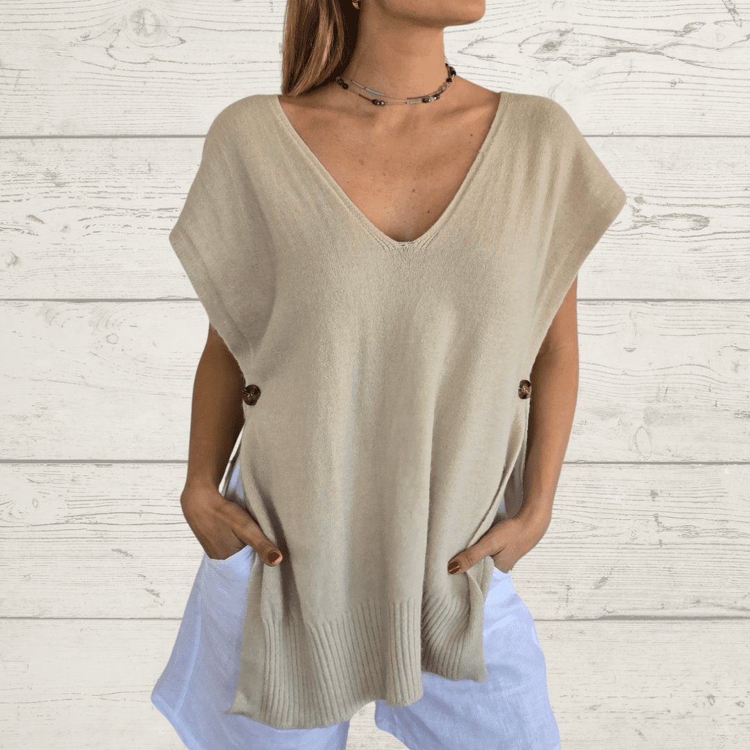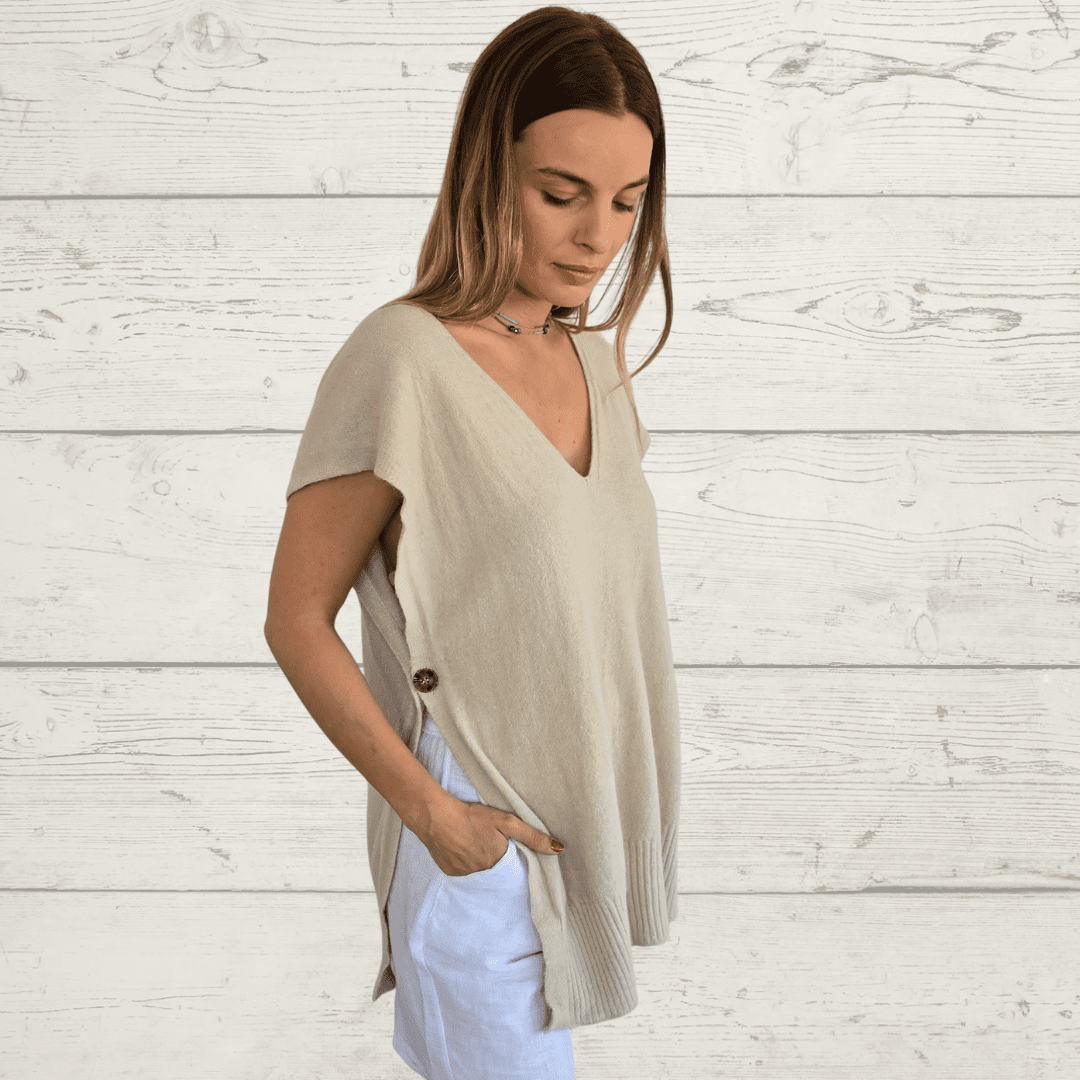 Jersey Adelfia italiano sin mangas con botones a los lados, de lana con viscosa y alpaca, color beige