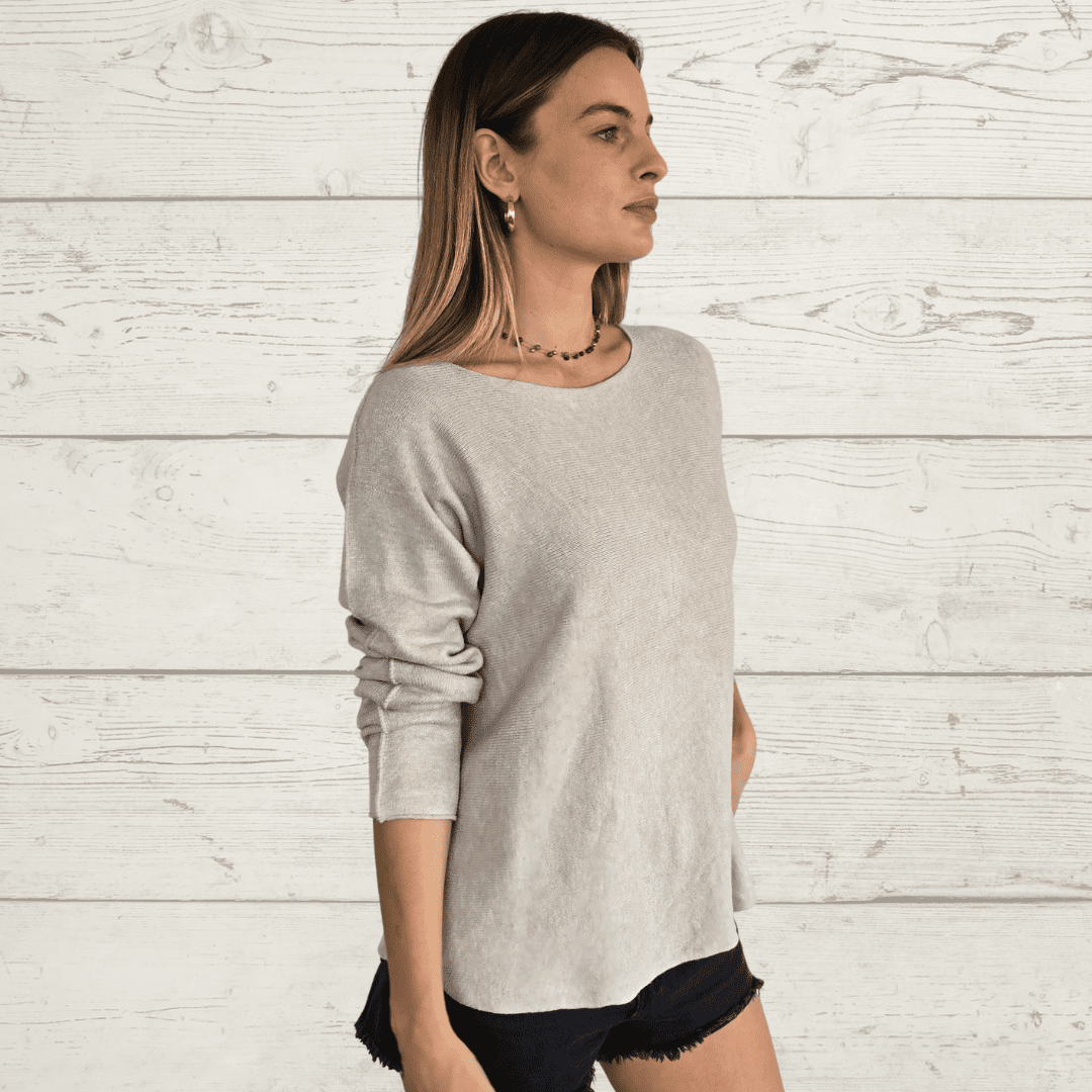 Sweater italiano básico, manga larga, cuello redondo, de poliviscosa con spandex, , color beige
