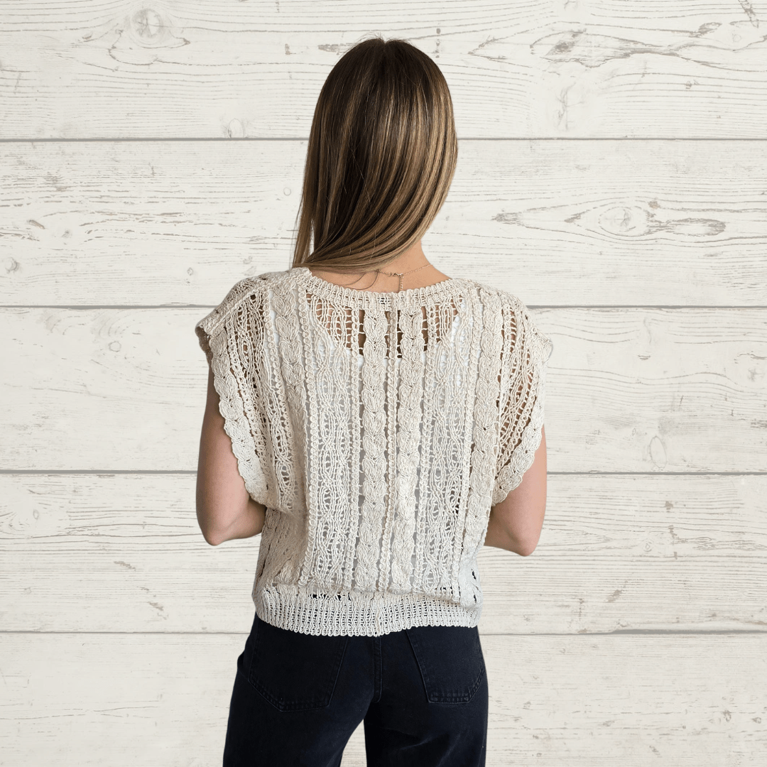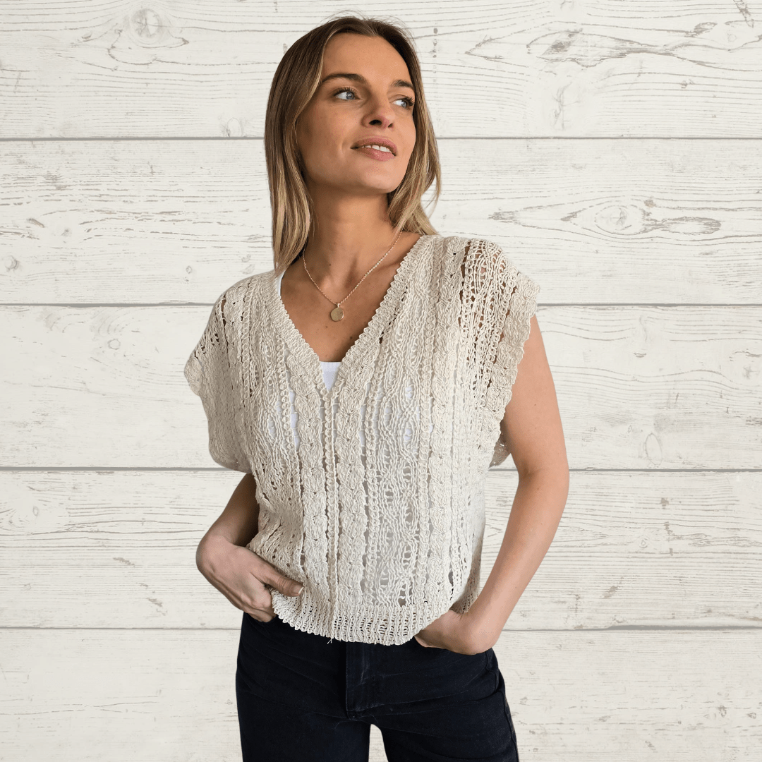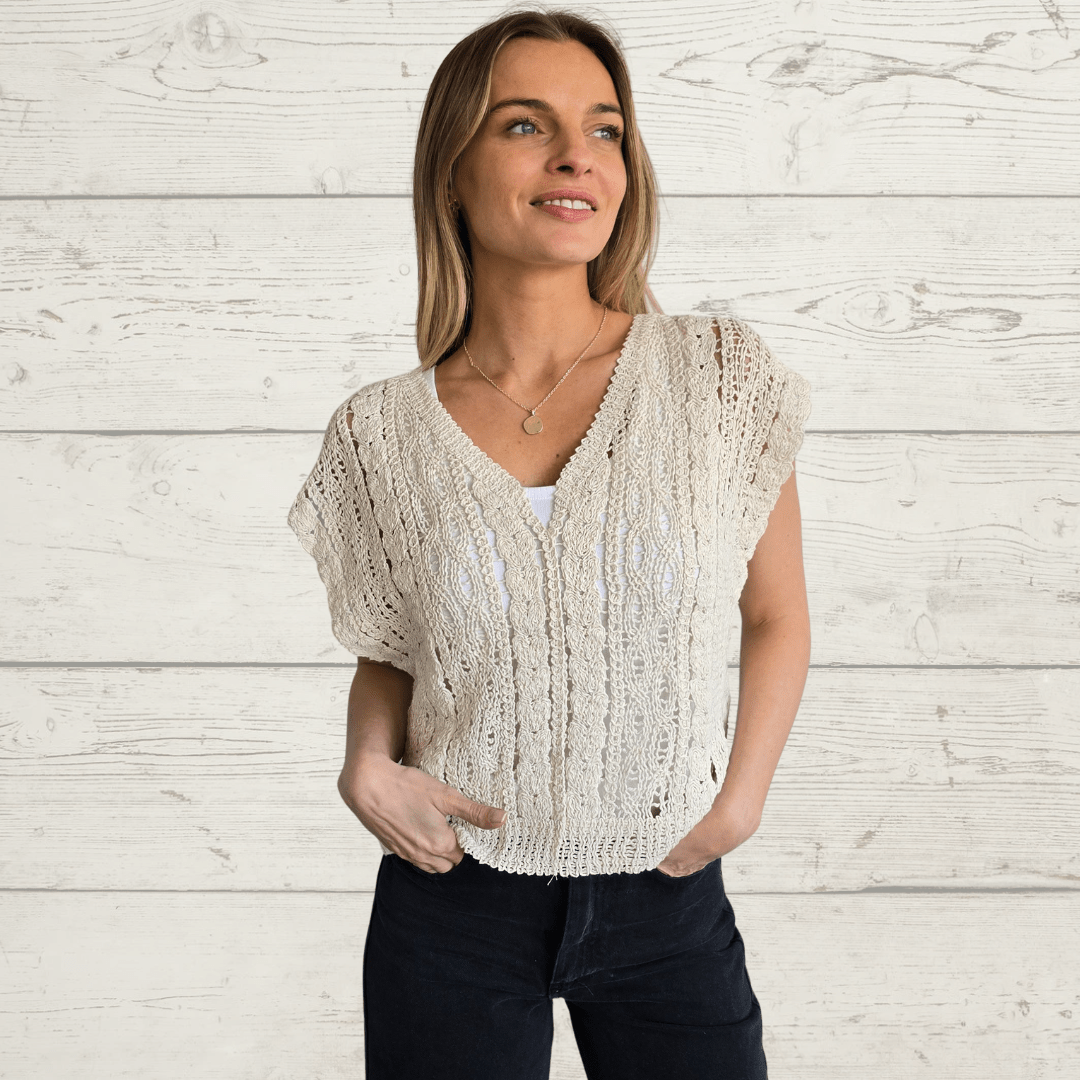 Jersey sin mangas tejido tipo crochet, de algodón, escote en V, color beige