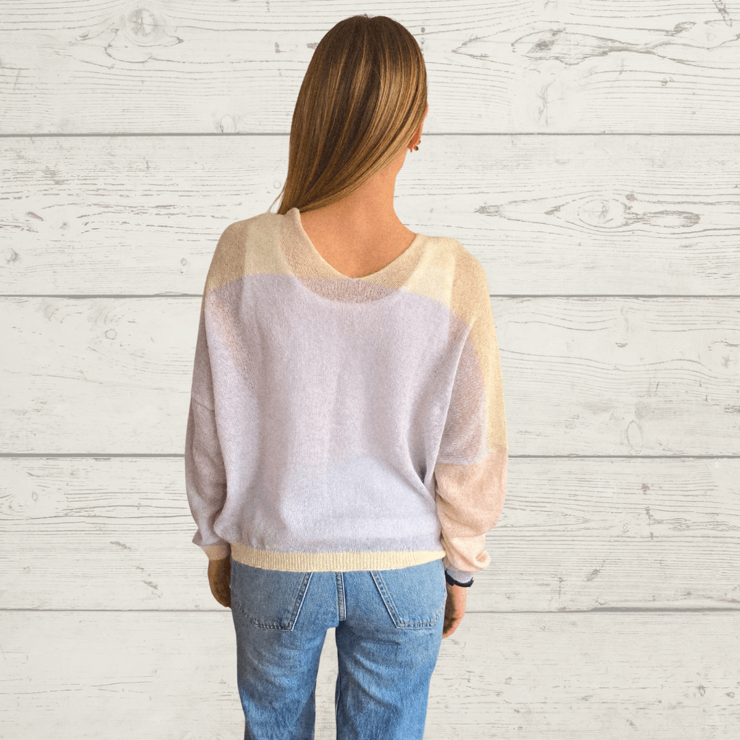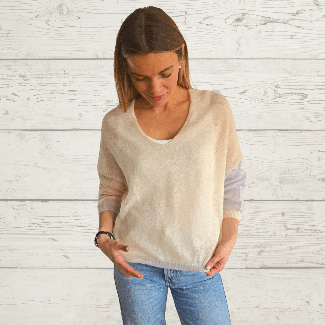 Sweater delgado tres colores, escote en V, viscosa con lana, fondo blanco invierno con rosado y celeste