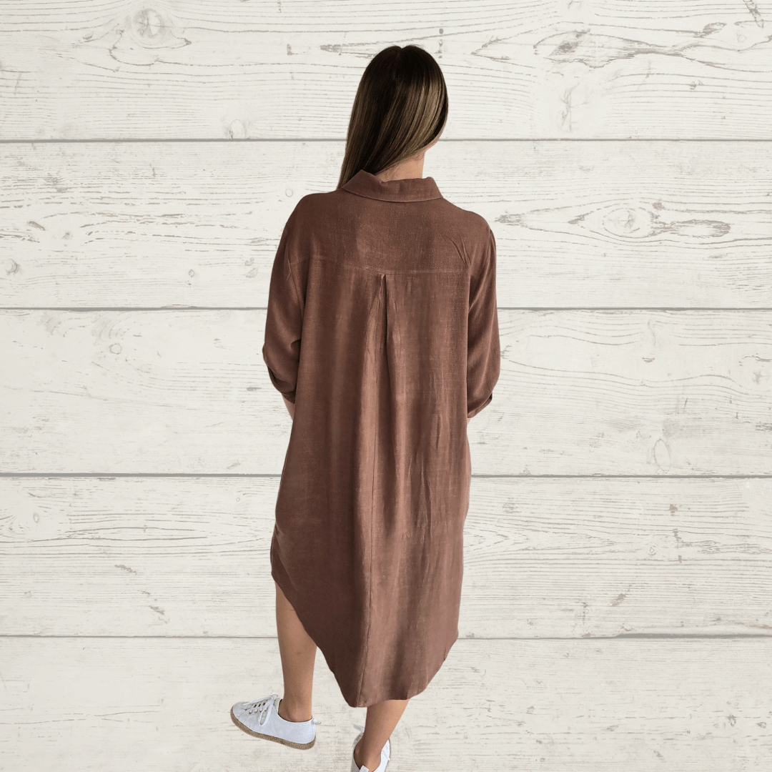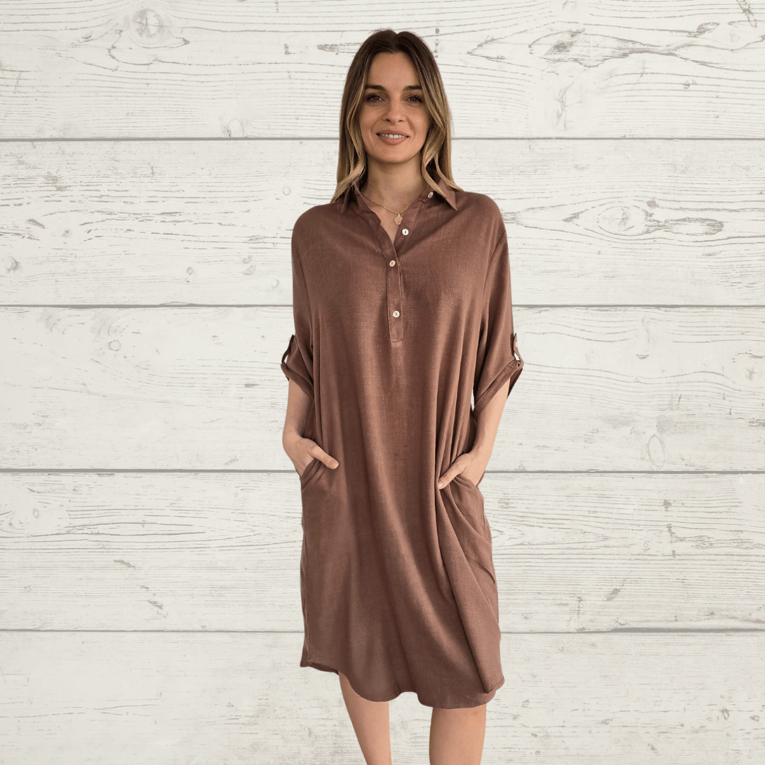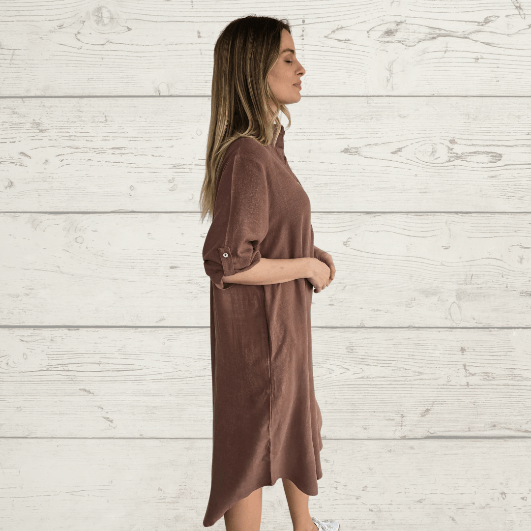 Vestido de algodón, manga 3/4, con dos bolsillos, color chocolate