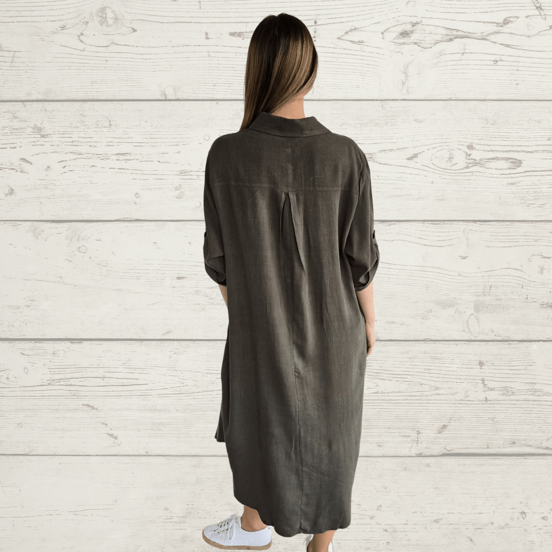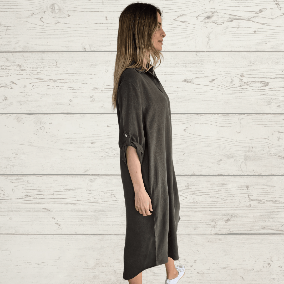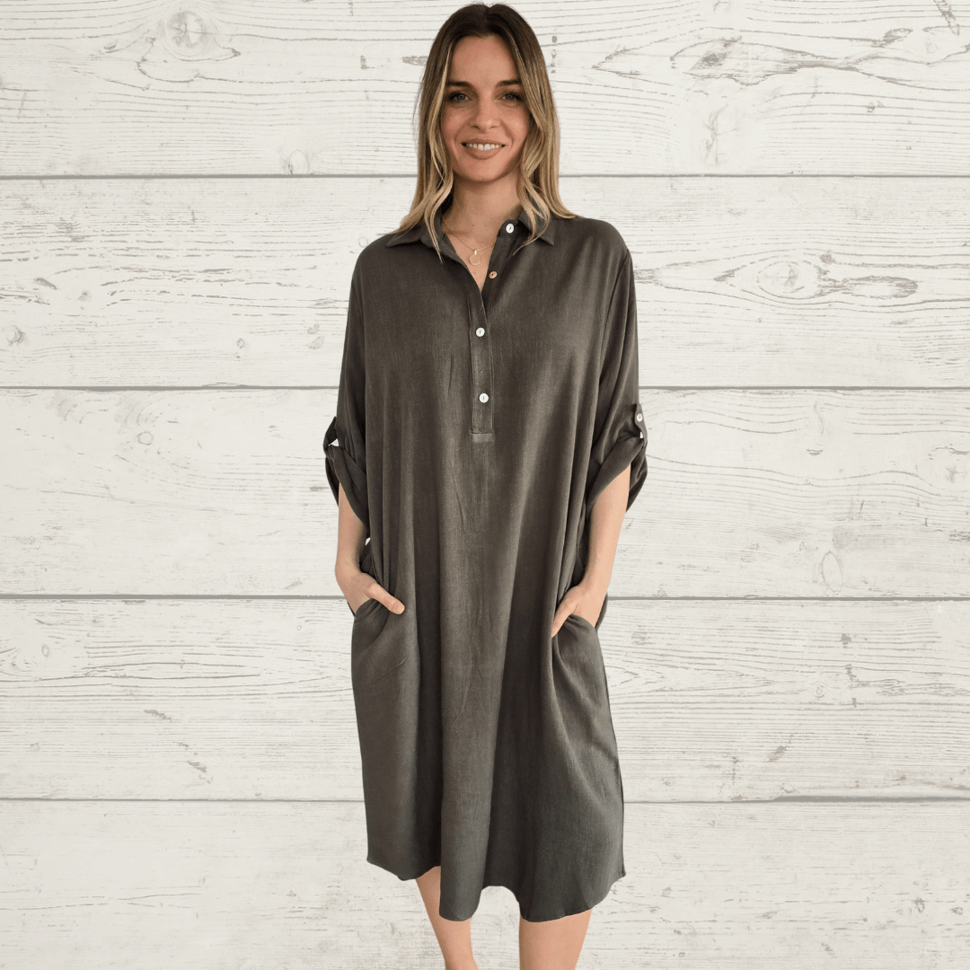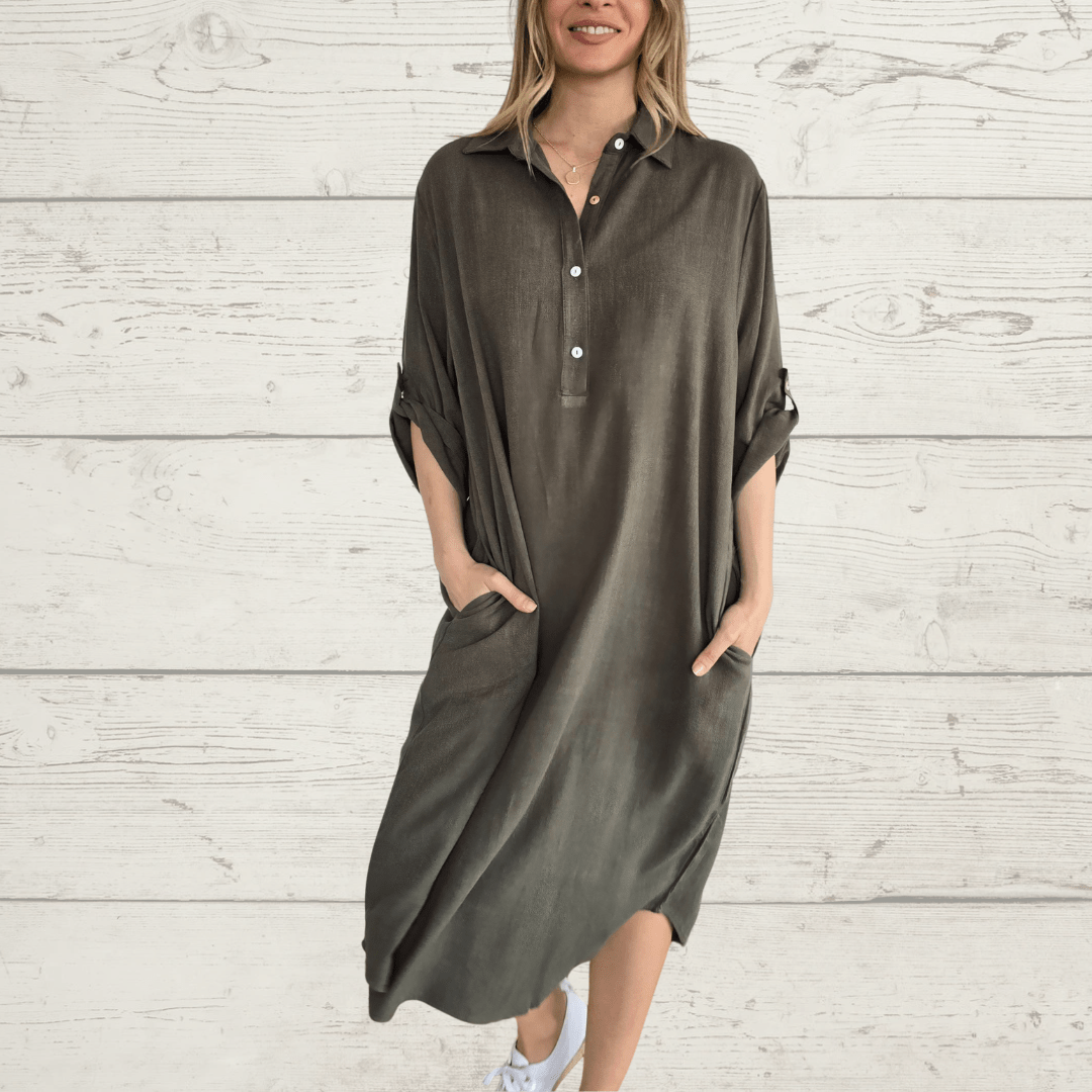 Vestido de algodón, manga 3/4, con dos bolsillos, color verde