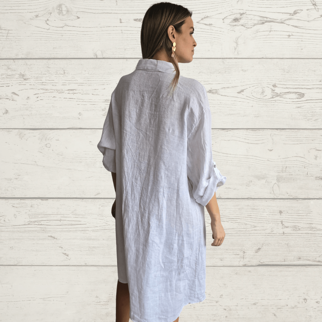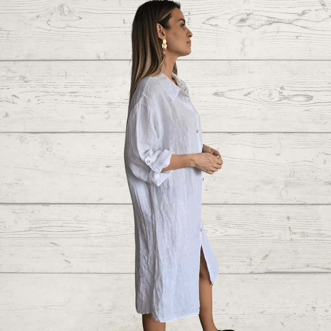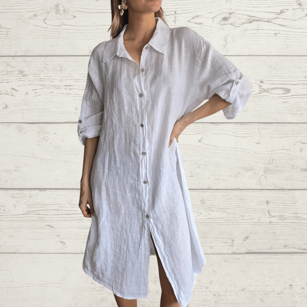 Vestido 100% de Lino Italiano, abotonado, manga 3/4, color blanco
