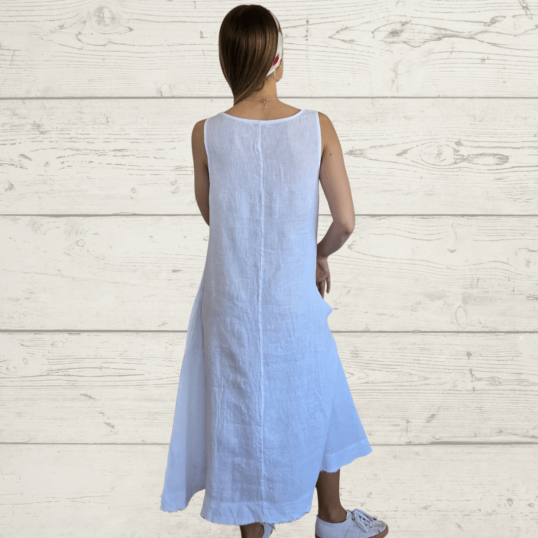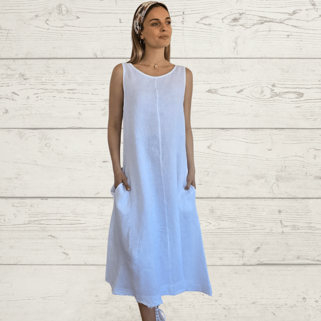 Vestido 100% lino italiano, basta desflecada, sin mangas, con bolsillos a los lados, color blanco
