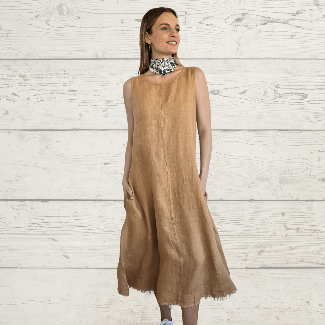Vestido 100% lino italiano, basta desflecada, sin mangas, con bolsillos a los lados, color camel