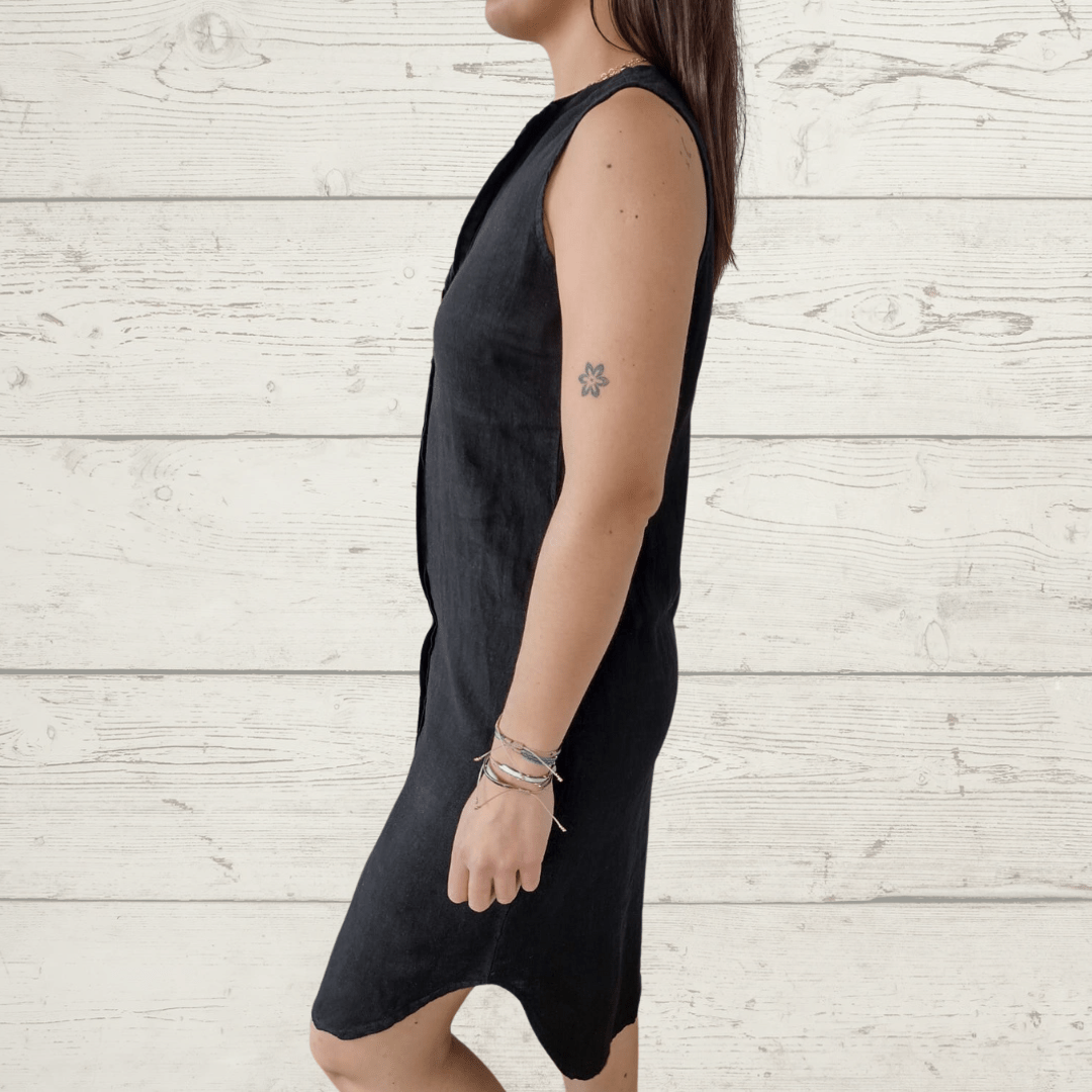 Vestido 100% lino italiano, escote con un botón grande, sin mangas, color negro