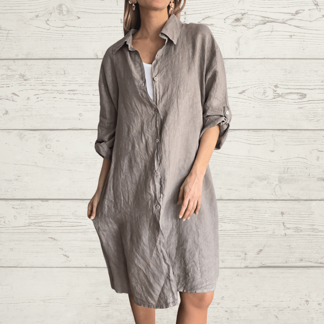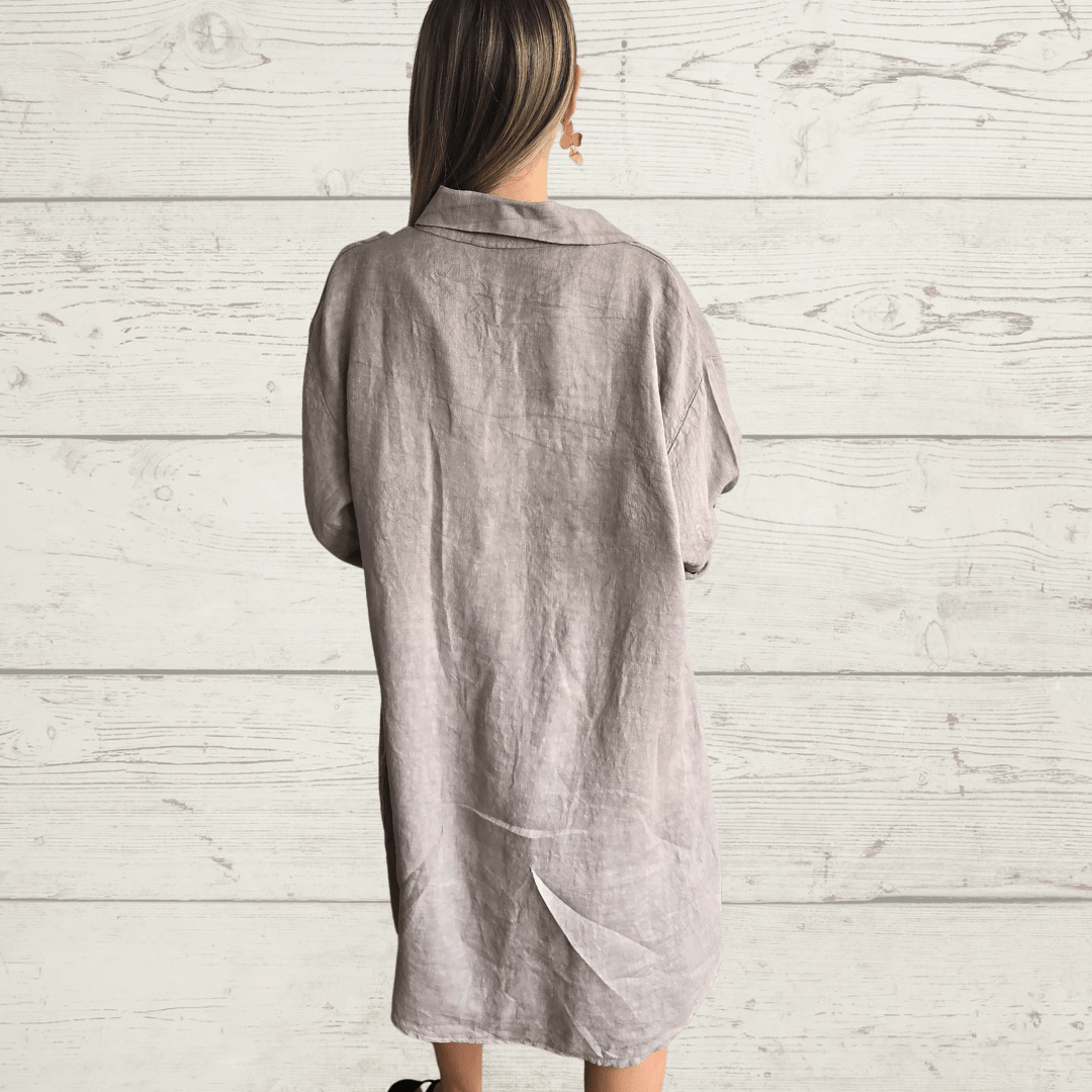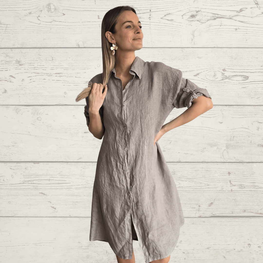 Vestido 100% de Lino Italiano, abotonado, manga 3/4, color taupe