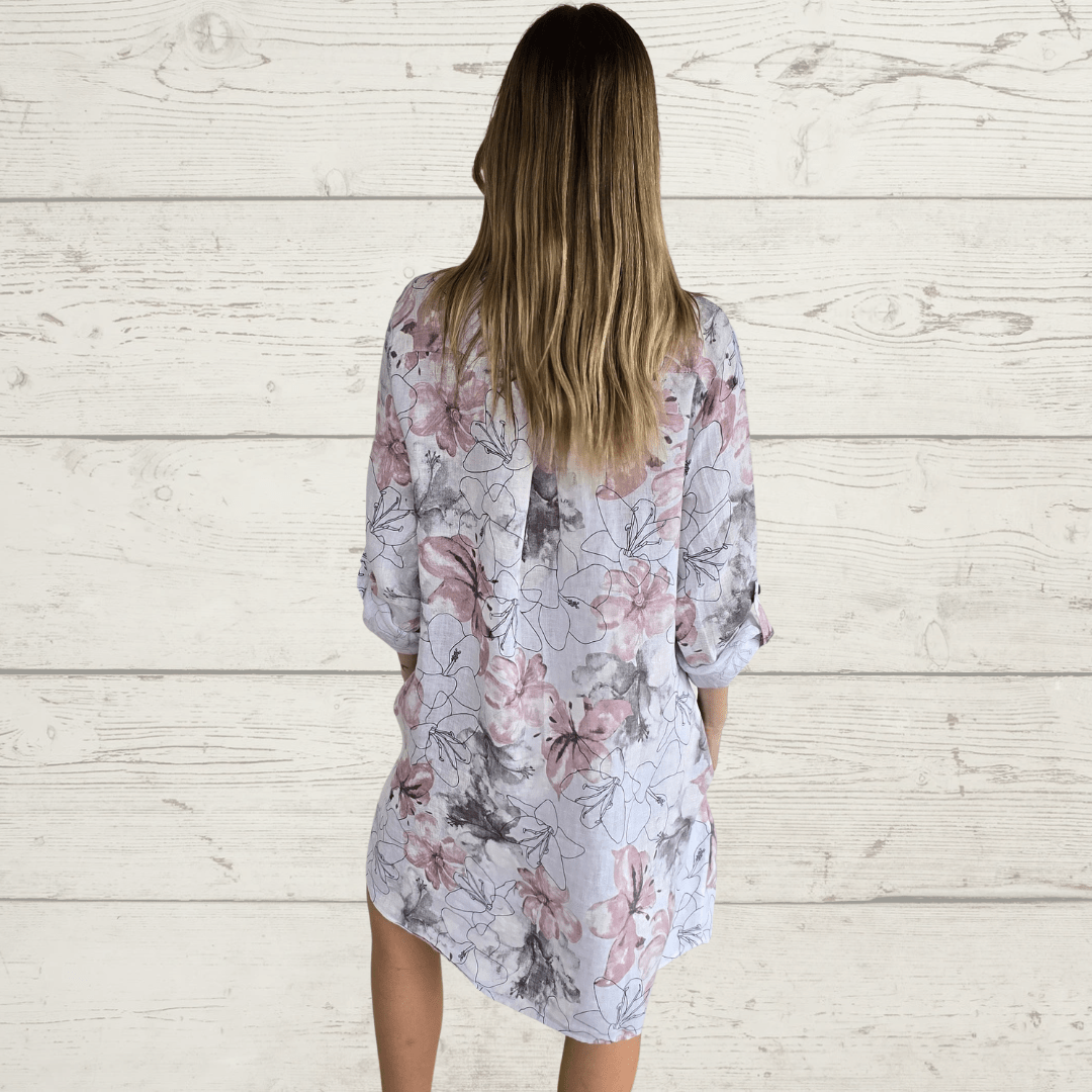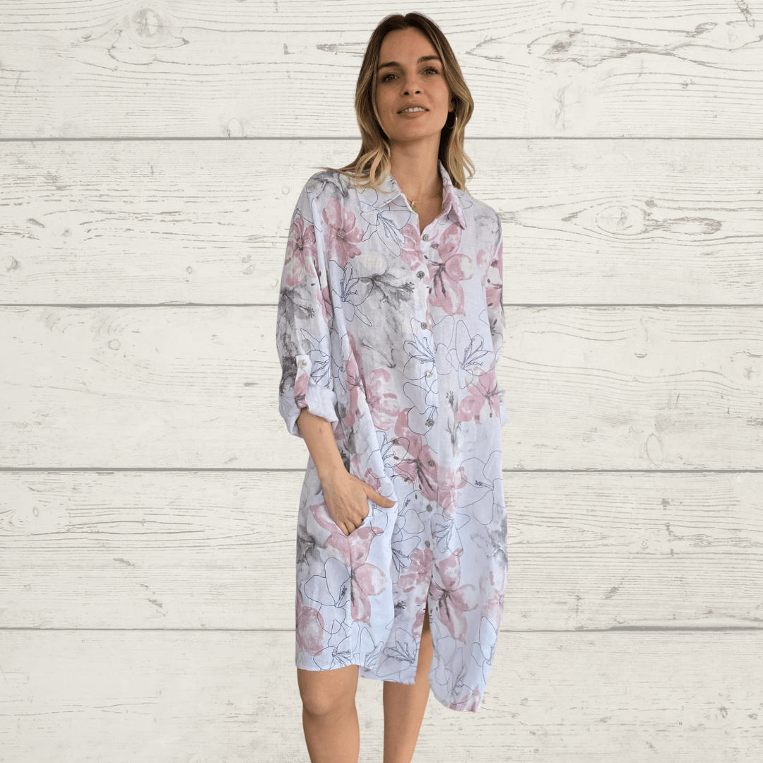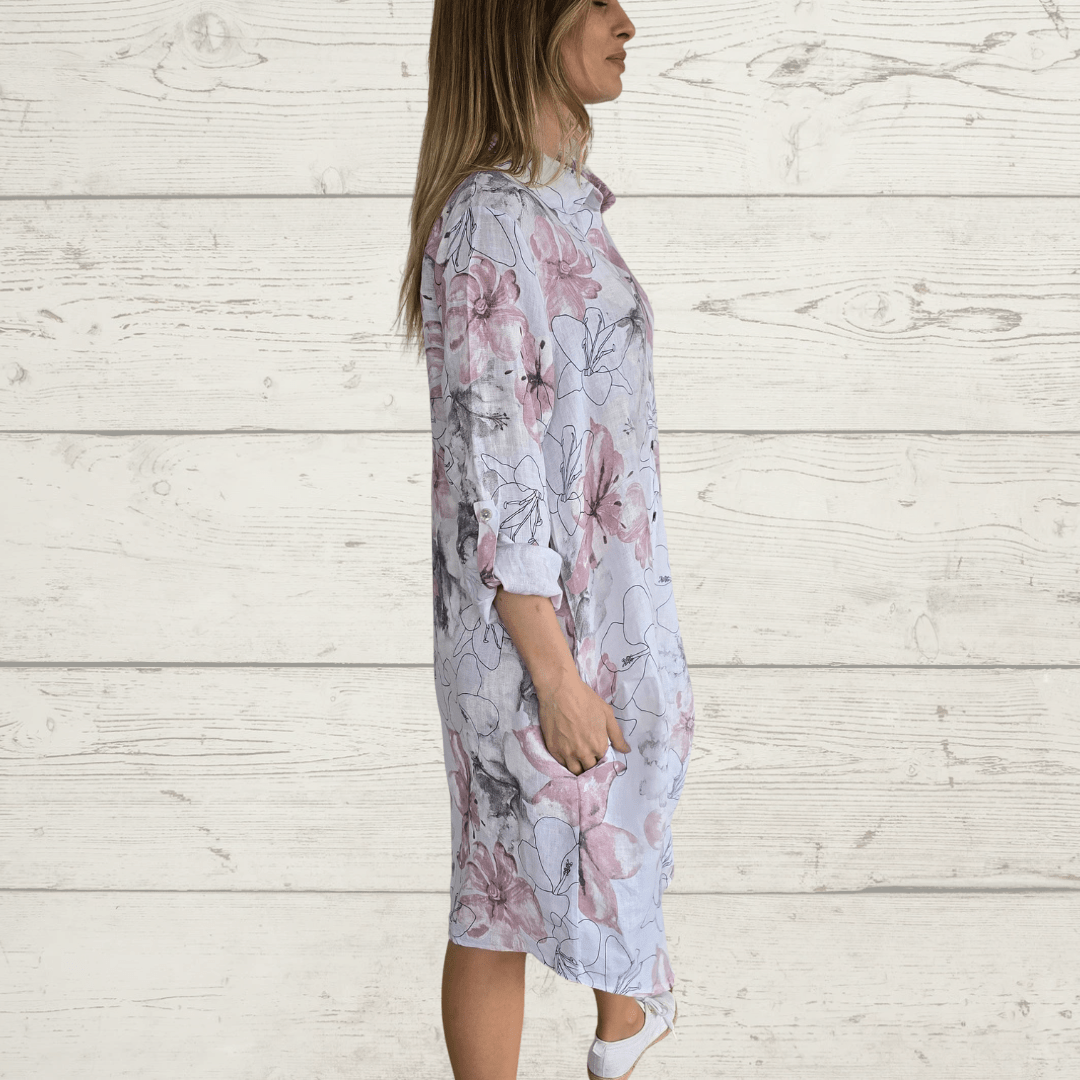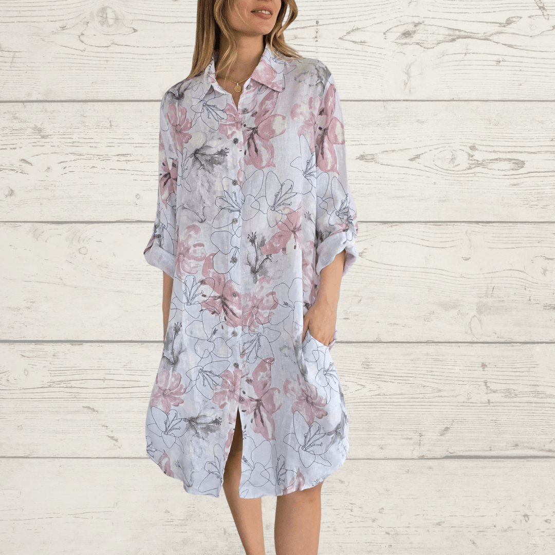 Vestido 100% Lino italiano estampado, abotonado, con bolsillos a los lados, manga 3/4, fondo blanco