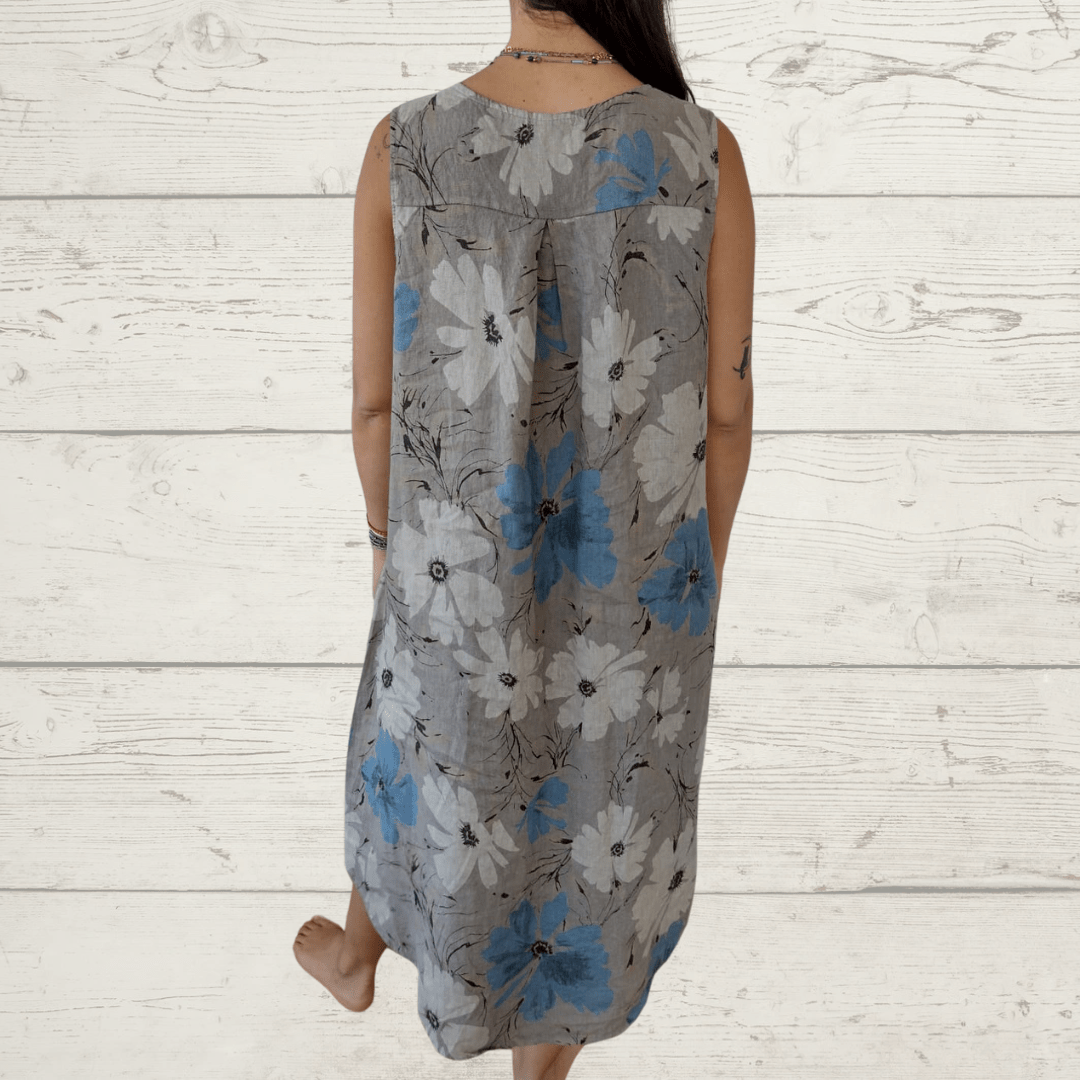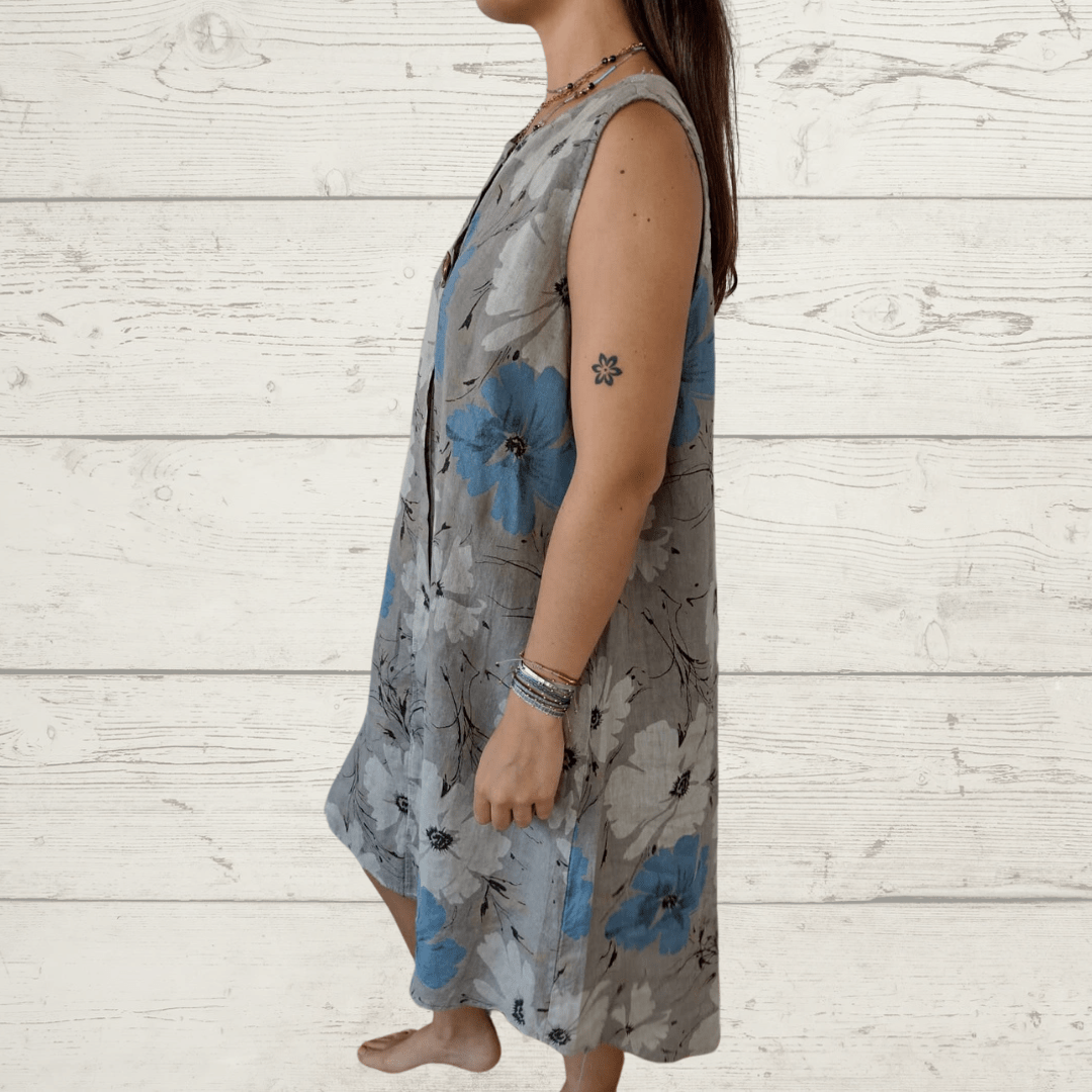 Vestido 100% Lino Italiano, estampado con un botón, sin mangas, fondo taupe