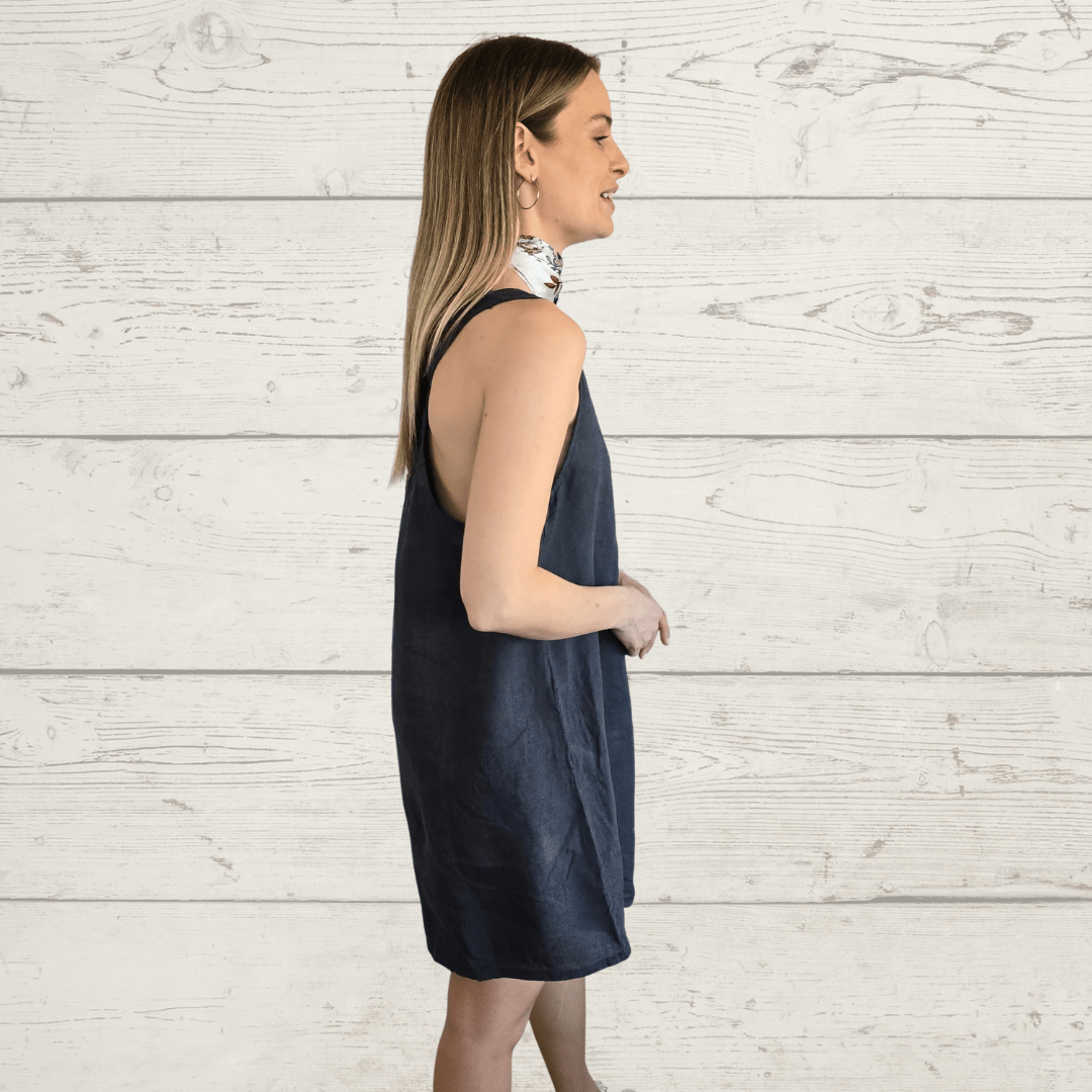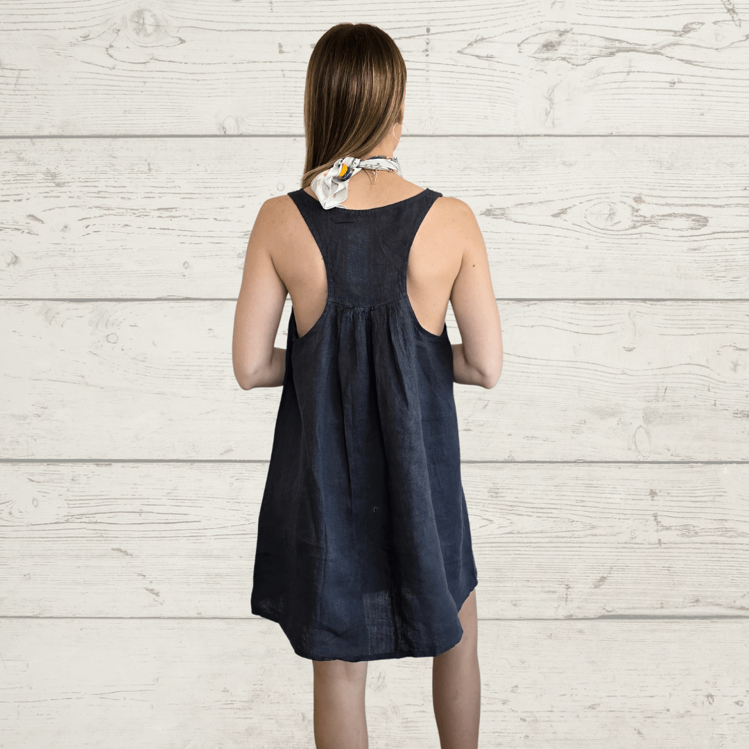 Vestido 100% lino italiano, sin mangas, espalda tipo musculosa, color gris