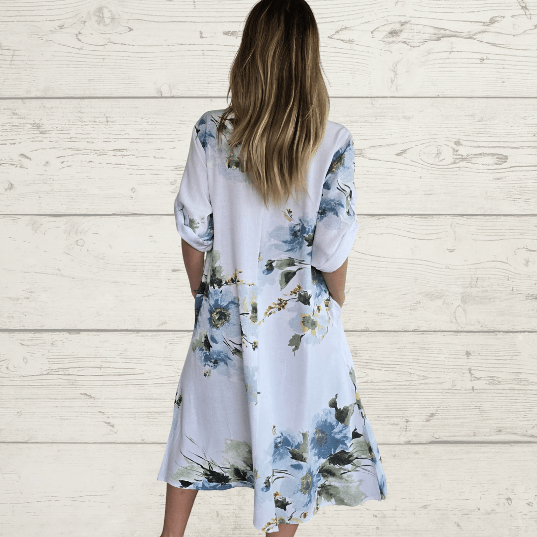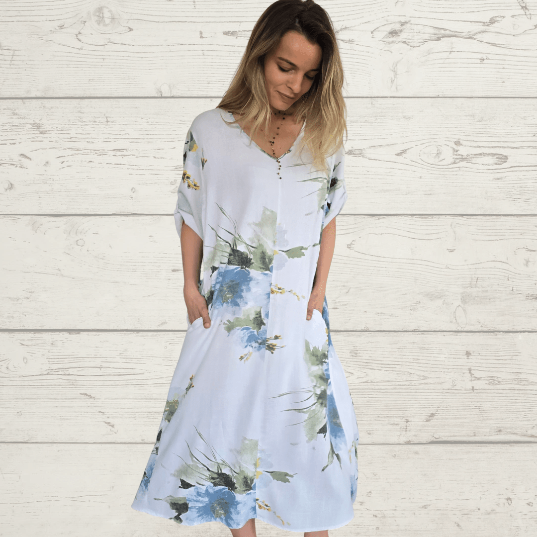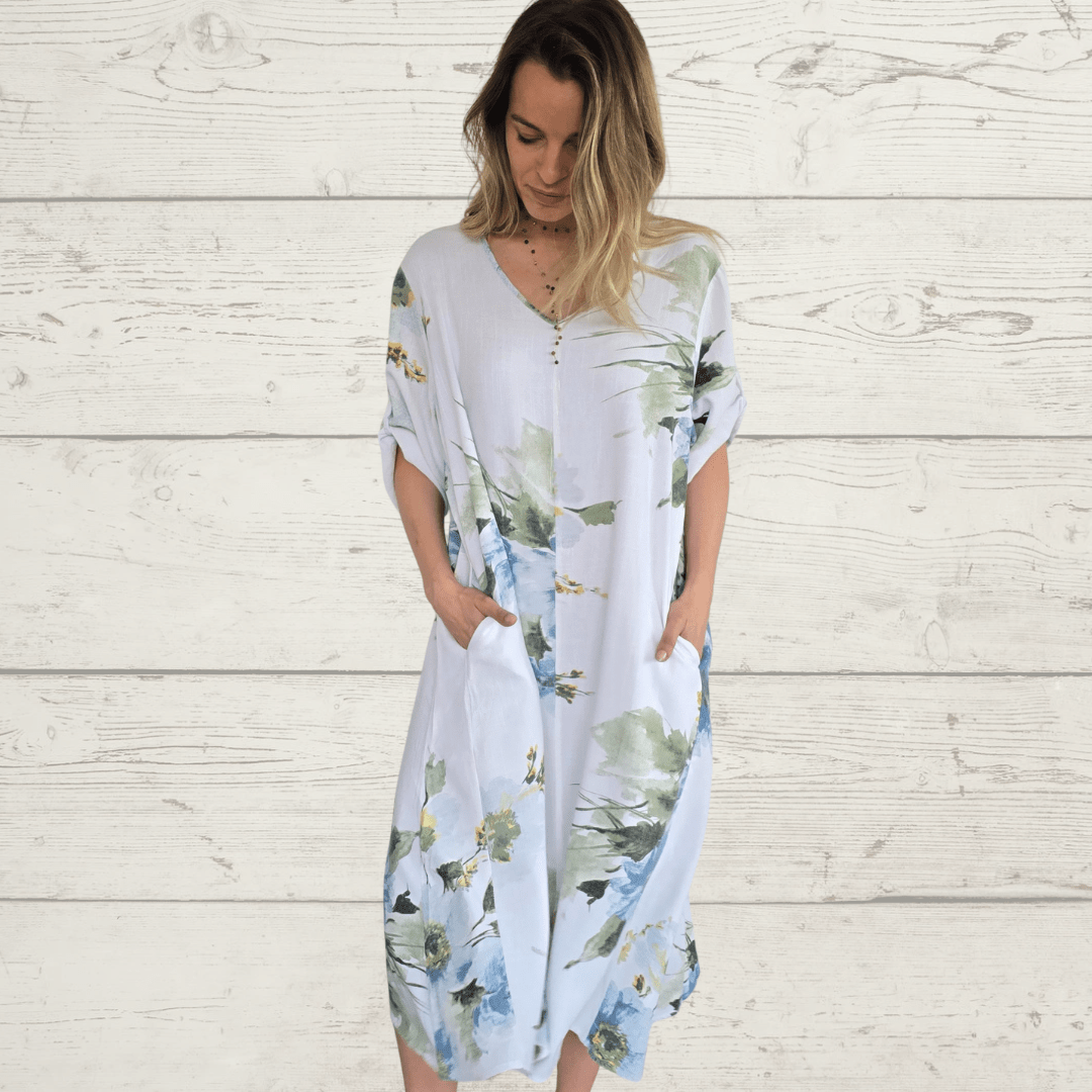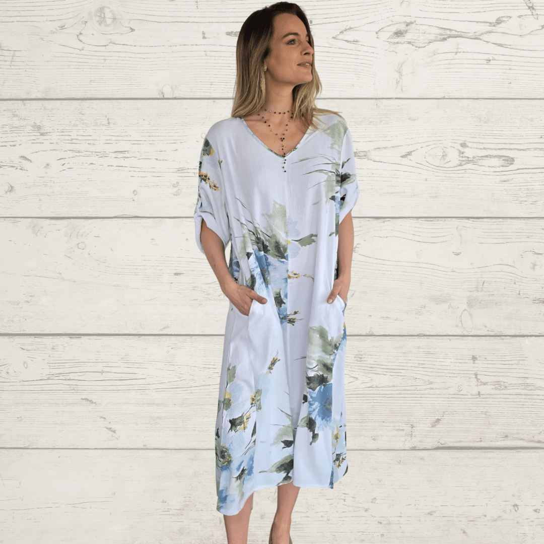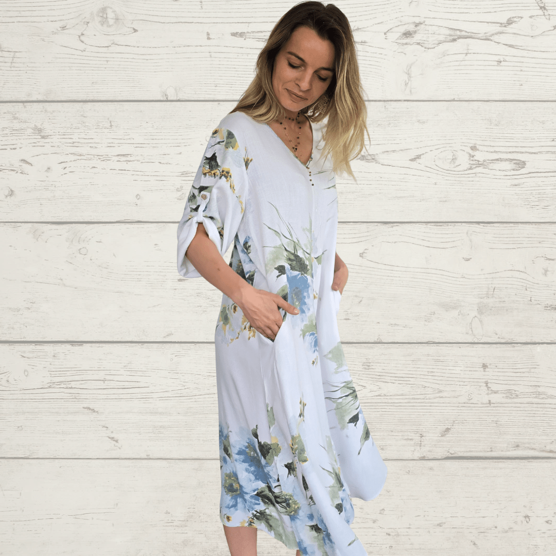 Vestido de algodón estampado flores, escote en V con bolsillos a los lados, manga corta, fondo blanco