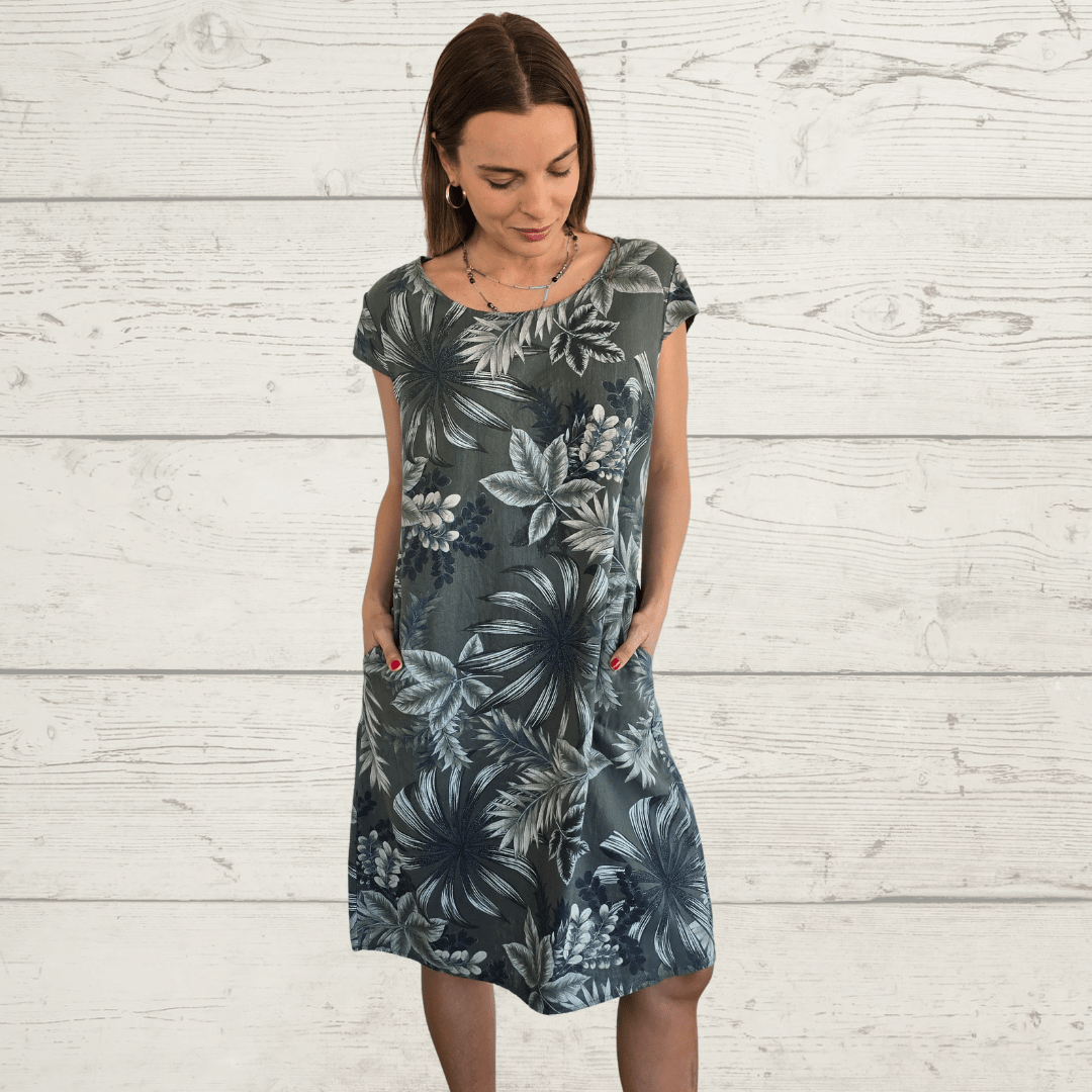 Vestido Florencia 100% lino italiano, estampado con hojas, bolsillos a los lados, fondo verde con hojas azules, verde y beige