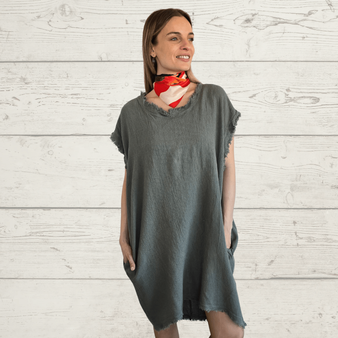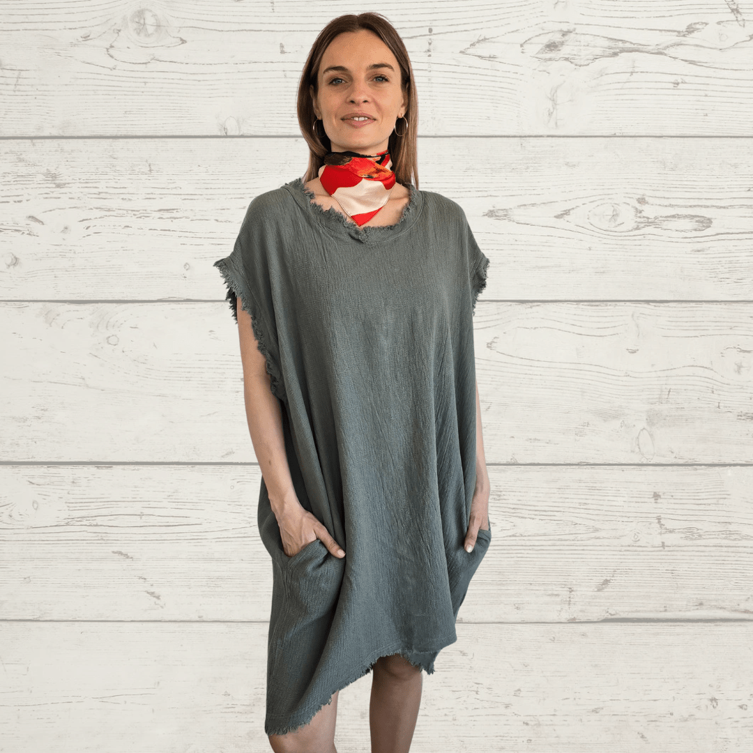 Vestido ancho de lino con algodón italiano, desflecado, con bolsillos a los lados, color verde musgo