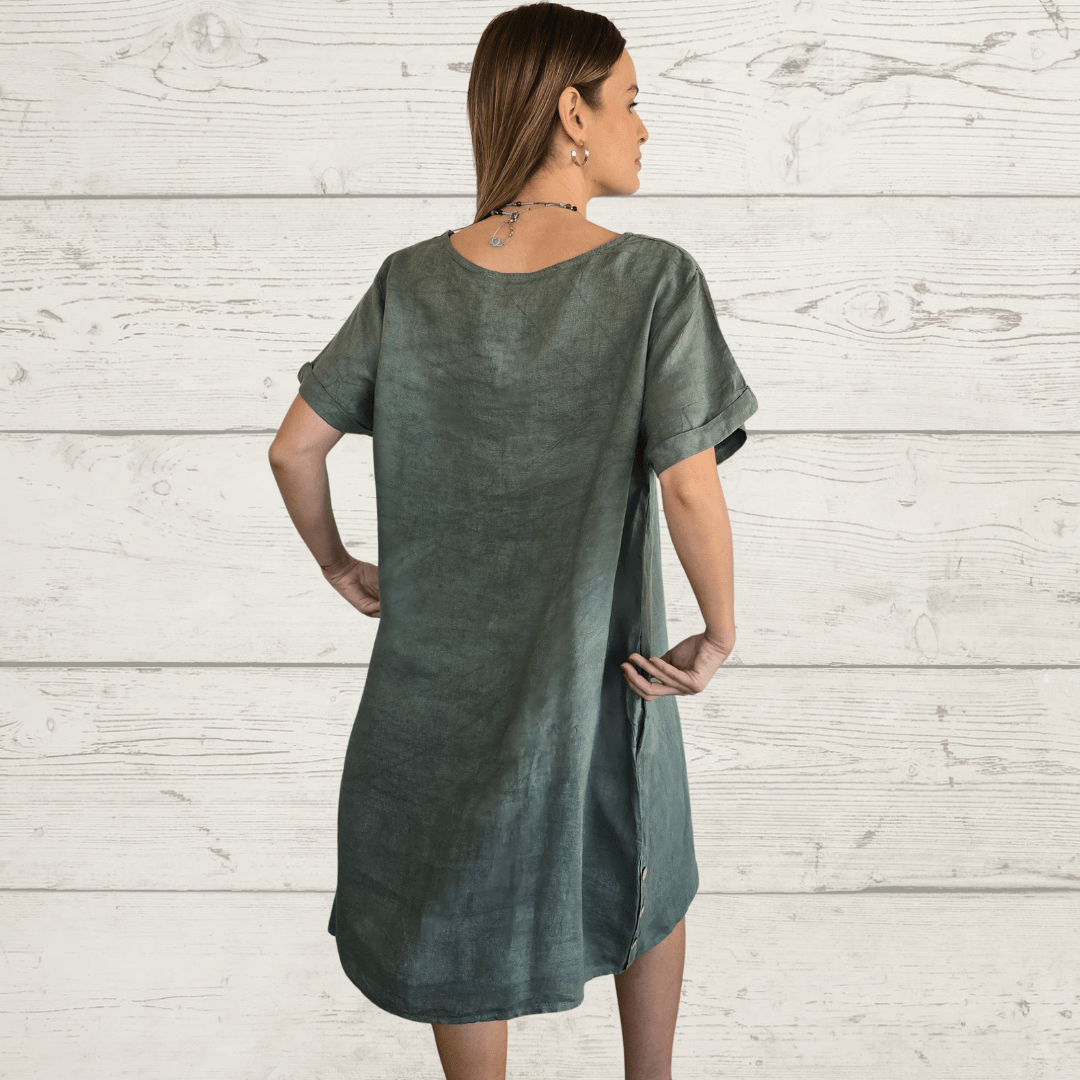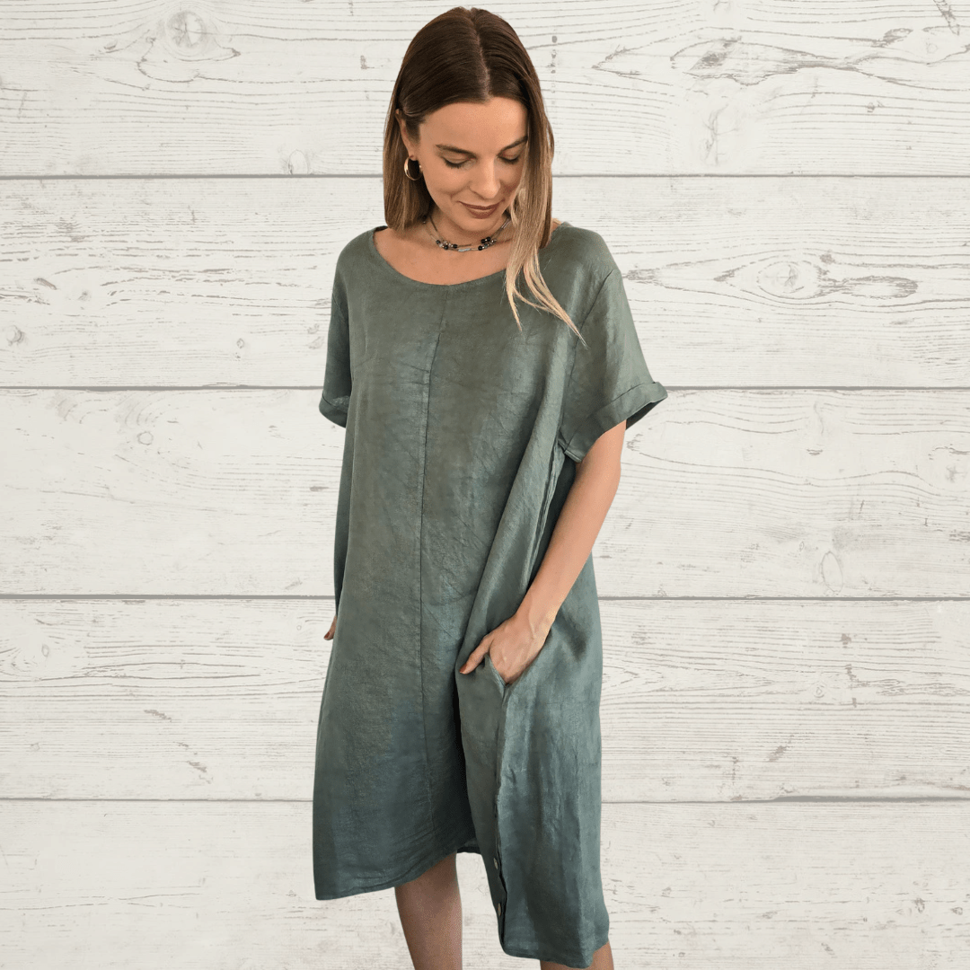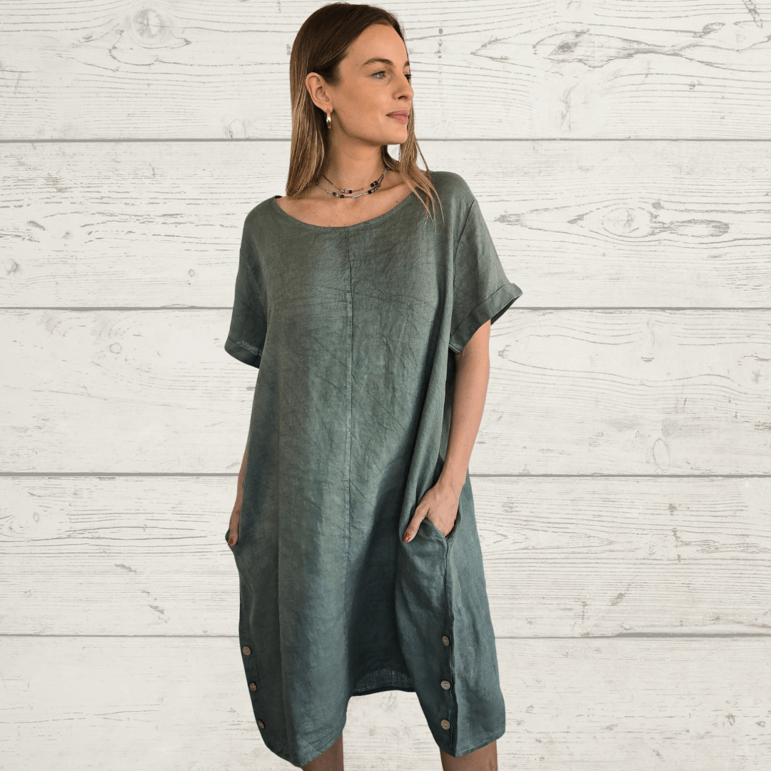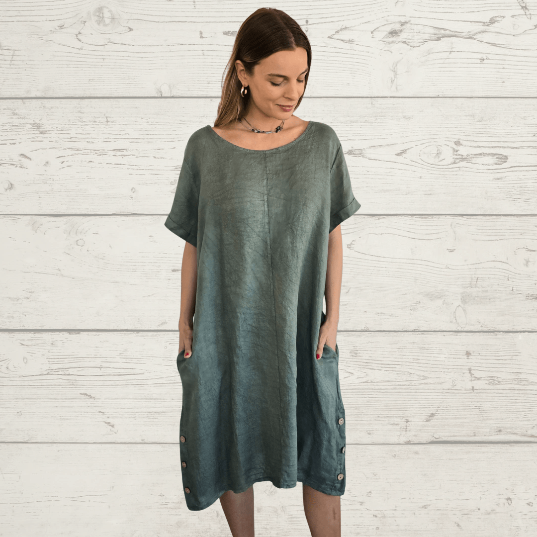 Vestido Liguria 100% Lino Italiano ,con botones a los lados, cuello redondo, manga corta y bolsillos a los lados, color verde