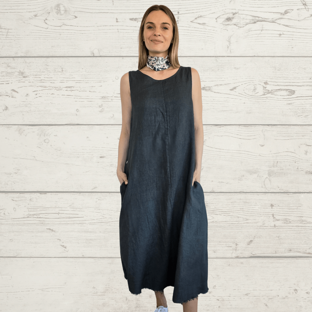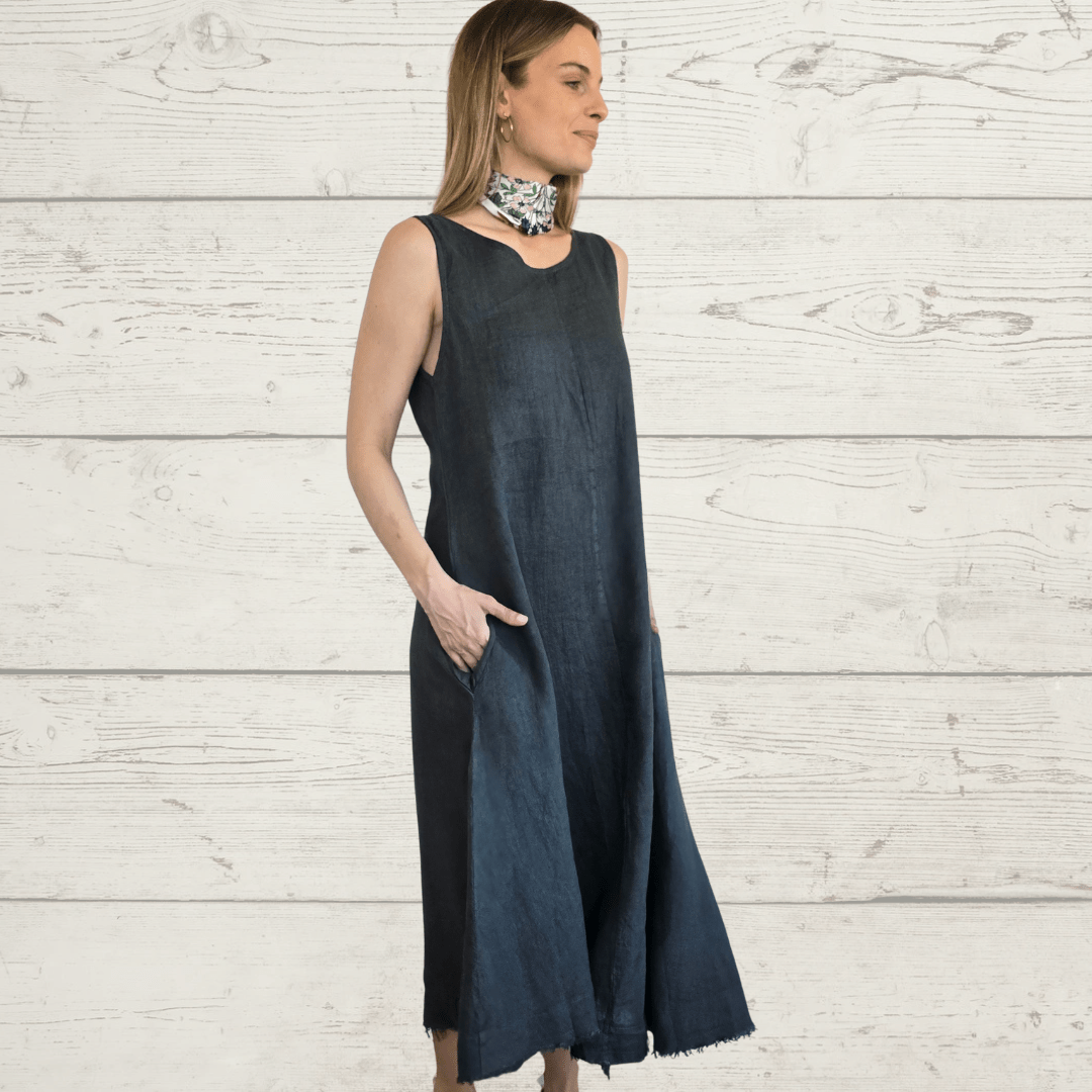Vestido 100% lino italiano, basta desflecada, sin mangas, con bolsillos a los lados, color gris